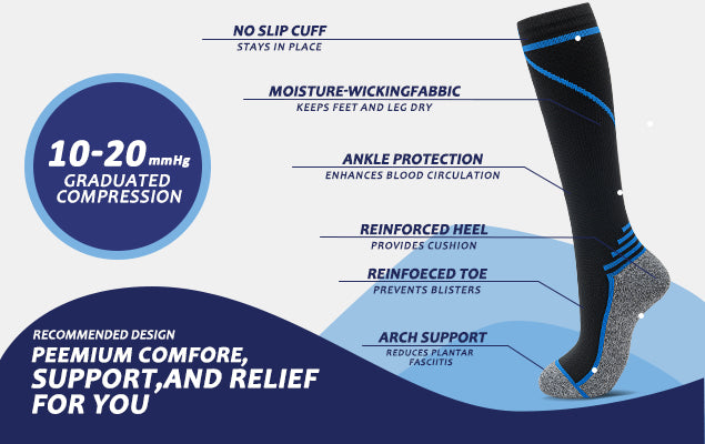 - Function: Improve blood circulation: By applying pressure from the ankle up, they help push blood back towards the heart. This is especially beneficial for people who stand or sit for long periods, as it reduces the risk of blood pooling in the lower extremities.